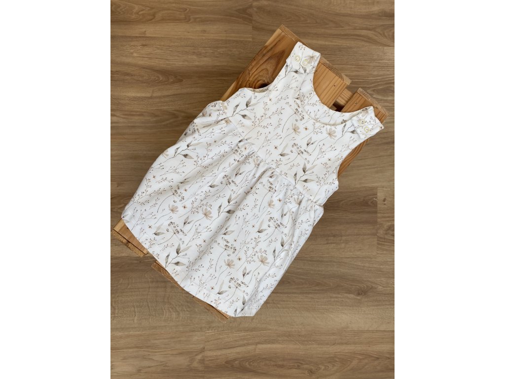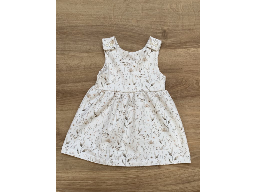 Jednoduché dětské šaty se zapínáním na ramenou. Šaty jsou šité z pružného úpletu s dvojitým živůtkem a řasenou sukní.
